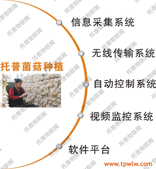 托普菌菇種植包括五大系統(tǒng):1.信息采集系統(tǒng)—可采集空氣溫濕度、土壤溫濕度、光照強(qiáng)度、二氧化碳強(qiáng)度等參數(shù);2.無線傳輸系統(tǒng)—可遠(yuǎn)程無線傳輸數(shù)據(jù);3.自動(dòng)控制系統(tǒng)—包括噴灌、卷簾、風(fēng)機(jī)、加熱、補(bǔ)光等,達(dá)到作物適合生長(zhǎng)環(huán)境;4.視頻監(jiān)控系統(tǒng)—查看作物實(shí)時(shí)生長(zhǎng)情況、病蟲害防治和自動(dòng)監(jiān)控功能;5.軟件平臺(tái)---遠(yuǎn)程數(shù)據(jù)實(shí)時(shí)查看參數(shù)和自動(dòng)控制功能,各類報(bào)警功能等。