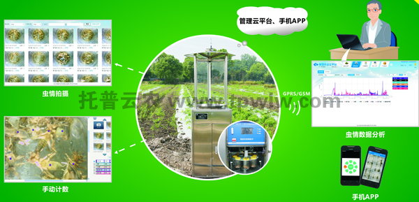 遠(yuǎn)程拍照式蟲(chóng)情測(cè)報(bào)燈利用移動(dòng)無(wú)線網(wǎng)絡(luò),定時(shí)采集現(xiàn)場(chǎng)圖像,自動(dòng)上傳到物聯(lián)網(wǎng)監(jiān)控平臺(tái),平臺(tái)自動(dòng)記錄采集數(shù)據(jù),形成蟲(chóng)害數(shù)據(jù)庫(kù)??捎脠D表、列表形式給農(nóng)業(yè)專(zhuān)家進(jìn)行遠(yuǎn)程診斷。工作人員可隨時(shí)遠(yuǎn)程了解田間蟲(chóng)情狀況,制定防治措施。通過(guò)手機(jī)APP,可遠(yuǎn)程查看田間視頻信息,田間墑情、蟲(chóng)情、環(huán)境氣象等數(shù)據(jù),也可在手機(jī)上直接進(jìn)行設(shè)備遠(yuǎn)程管理或在線專(zhuān)家咨詢(xún)。