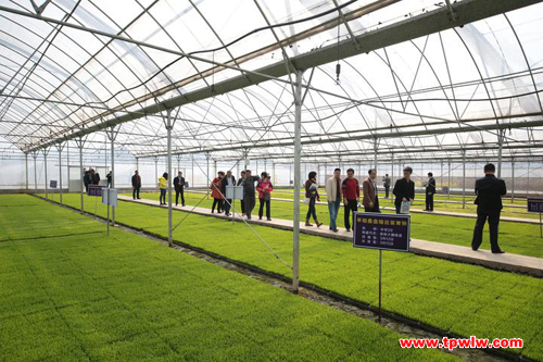 圖為:交流會人員在參觀智能化育秧大棚