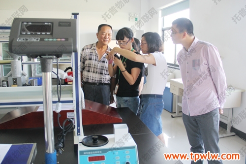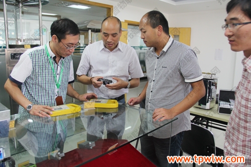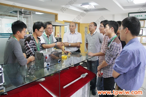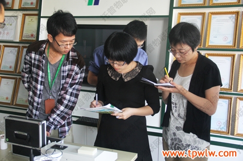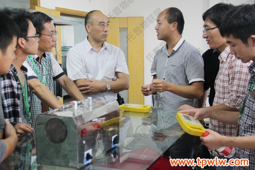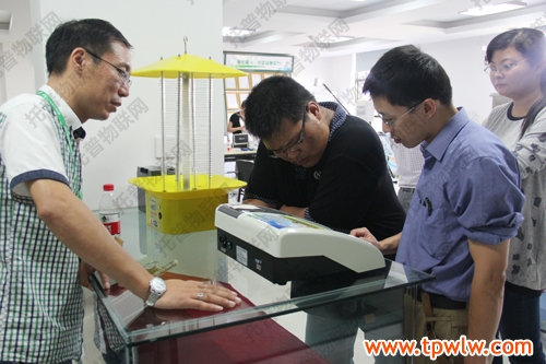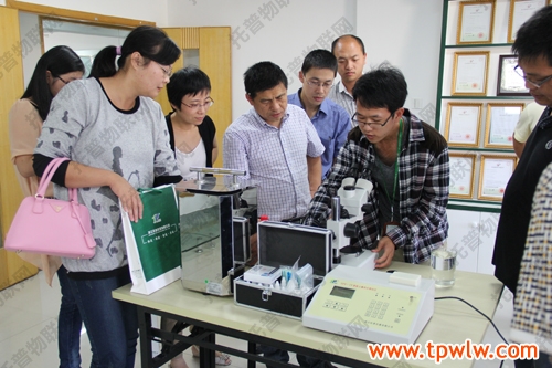 圖為:嘉善縣農(nóng)經(jīng)局科教科郁新偉科長(著白色衣服)與眾人一起討論儀器相關(guān)知識(shí)