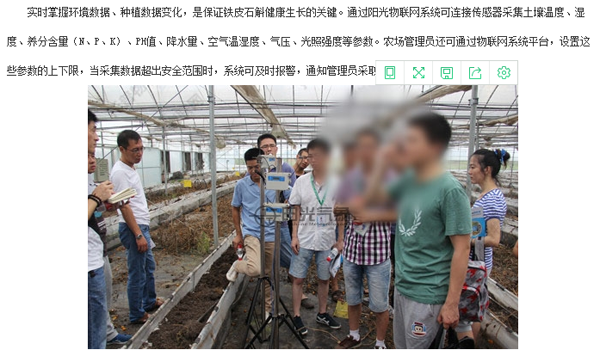 在《陽光物聯(lián)網(wǎng)引領(lǐng)仙草(鐵皮石斛)種植新方式》一文中,不僅“學(xué)習(xí)”物聯(lián)網(wǎng)系統(tǒng)的建設(shè)原理,以及操作方式外,還引用當(dāng)時(shí)參觀時(shí)拍攝的圖片。為了降低圖片的辨識度,還對圖片進(jìn)行模糊處理。