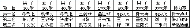此次田徑運(yùn)動(dòng)會(huì)分為男子100米、女子100米;男子400米,女子400米;男子1000米,女子800米;男子3000米,女子3000米;男女混合4*200米接力賽。賽制為,初賽?。拷M取前兩名和成績(jī)最好的兩名共六名人員進(jìn)入決賽)前三名進(jìn)入決賽,決賽取前三名為獲獎(jiǎng)選手。上午9:10,運(yùn)動(dòng)會(huì)在女子400米初賽中拉開(kāi)帷幕。