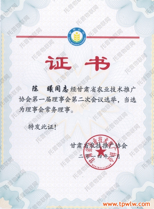 圖為:托普儀器陳曦經(jīng)理任甘肅省農(nóng)業(yè)技術(shù)推廣協(xié)會常務(wù)理事證書