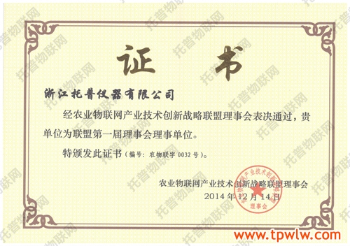 2014年6月7日,北京智慧農(nóng)業(yè)物聯(lián)網(wǎng)產(chǎn)業(yè)技術(shù)創(chuàng)新戰(zhàn)略聯(lián)盟籌備成立大會暨第一次會員代表大會在北京召開。會議宣讀了決定準(zhǔn)予《北京智慧農(nóng)業(yè)物聯(lián)網(wǎng)產(chǎn)業(yè)技術(shù)創(chuàng)新戰(zhàn)略聯(lián)盟》籌備的行政批復(fù),并經(jīng)首屆理事會表決,選舉產(chǎn)生了第一屆聯(lián)盟組織機(jī)構(gòu),其中包括首屆聯(lián)盟主席單位,五家聯(lián)盟副主席單位,“浙江托普儀器有限公司”等八家單位當(dāng)選為聯(lián)盟第一屆理事會理事單位。